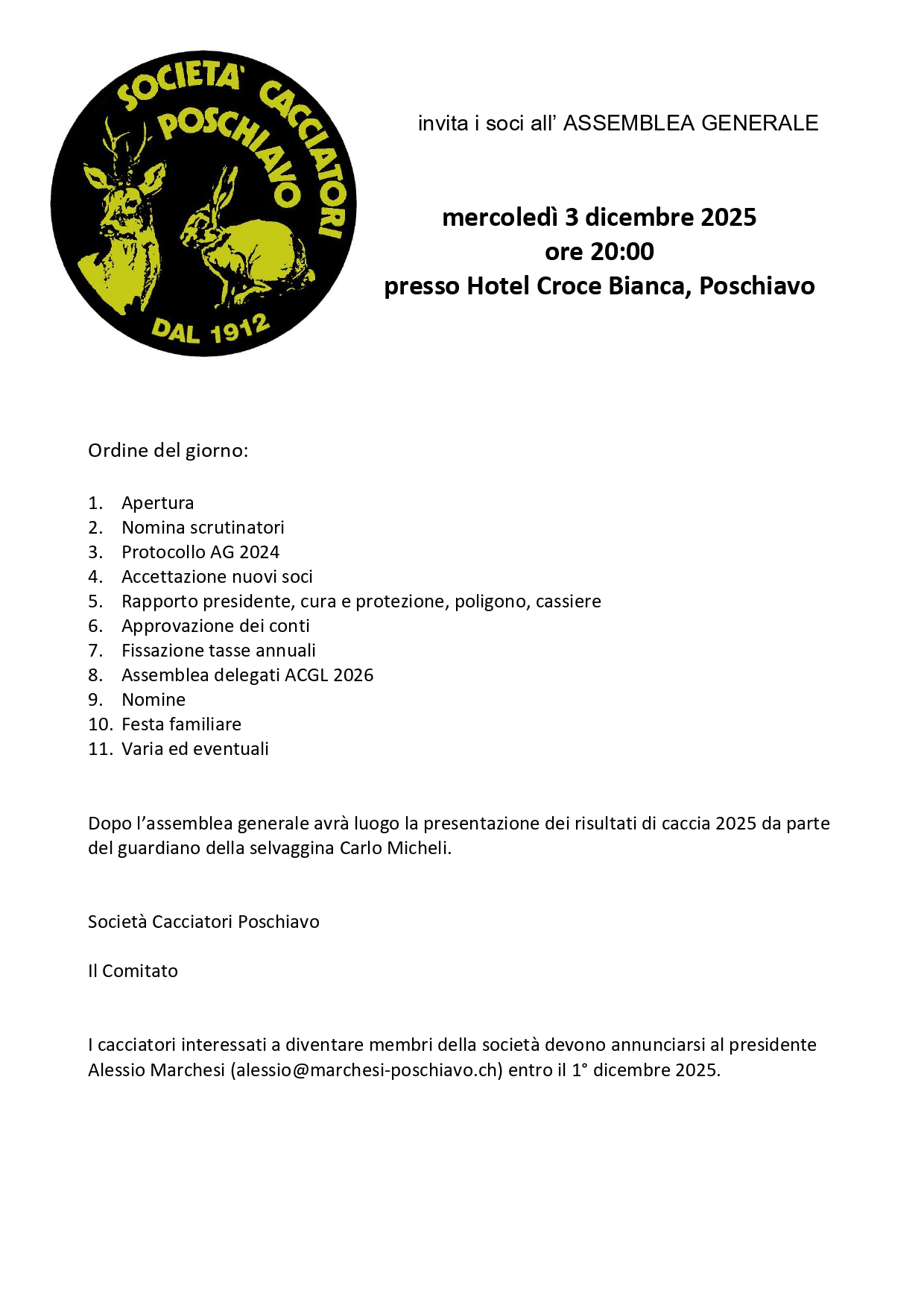 La Società Cacciatori Poschiavo invita i soci all’ ASSEMBLEA GENERALE Martedì 17 dicembre 2024, ore 20:00, presso Hotel Posta, Le Prese
